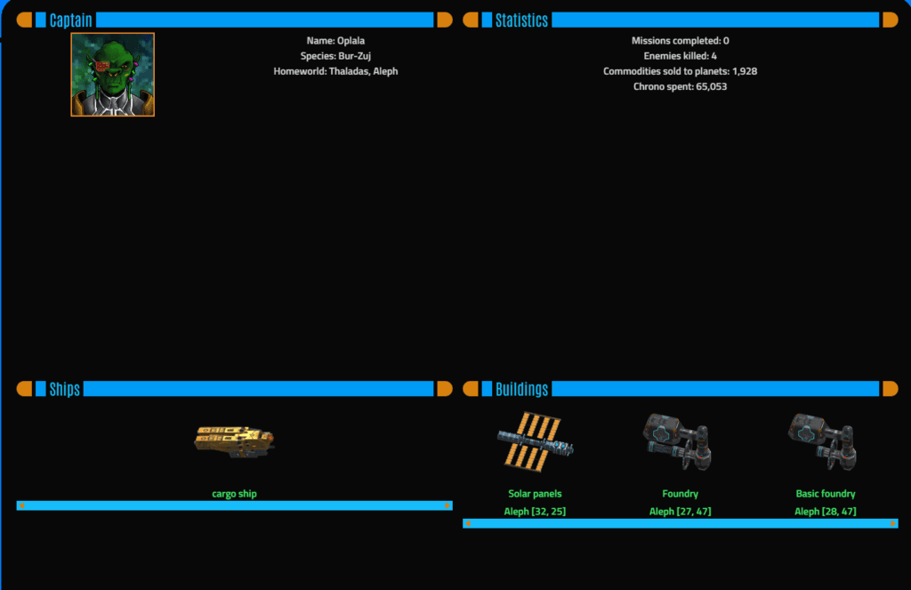 Two really cool features to bring your character to life and distinguish yourself in the universe. There are now public profiles for each character, currently accessible by clicking on one’s name in the news or in chat. Here you can show off your kill count, buildings, and more. You can view your own personal stats on the Roster tab.